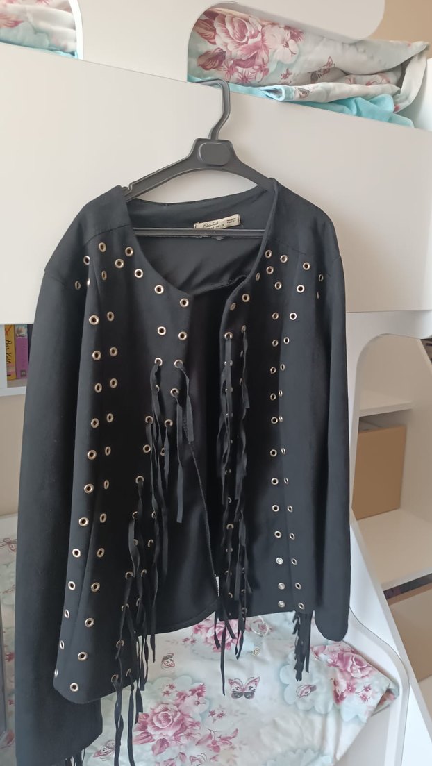 Siyah uzun deri ceket, düğmeli ve notched lapel yakaya sahip. Uzun kollu, bol kesim ve gotik bohem tarzını yansıtan baskılı detayları vardır.