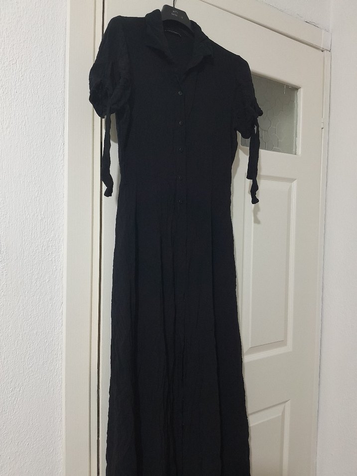 Düğmeli, kısa kollu siyah uzun elbise, bol kesim ve kesik yaka detayına sahiptir. Desensiz ve günlük kullanıma uygundur.