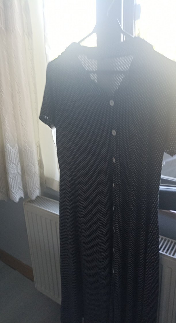 Düğmeli, V yakalı, kısa kollu siyah uzun elbise Minimalist gotik tarzda, günlük kullanıma uygun şık bir model. önden düğmeli ama diktirdim önünü oturunca açılmyo düğmeler likralı 44 46 beden uyumlu