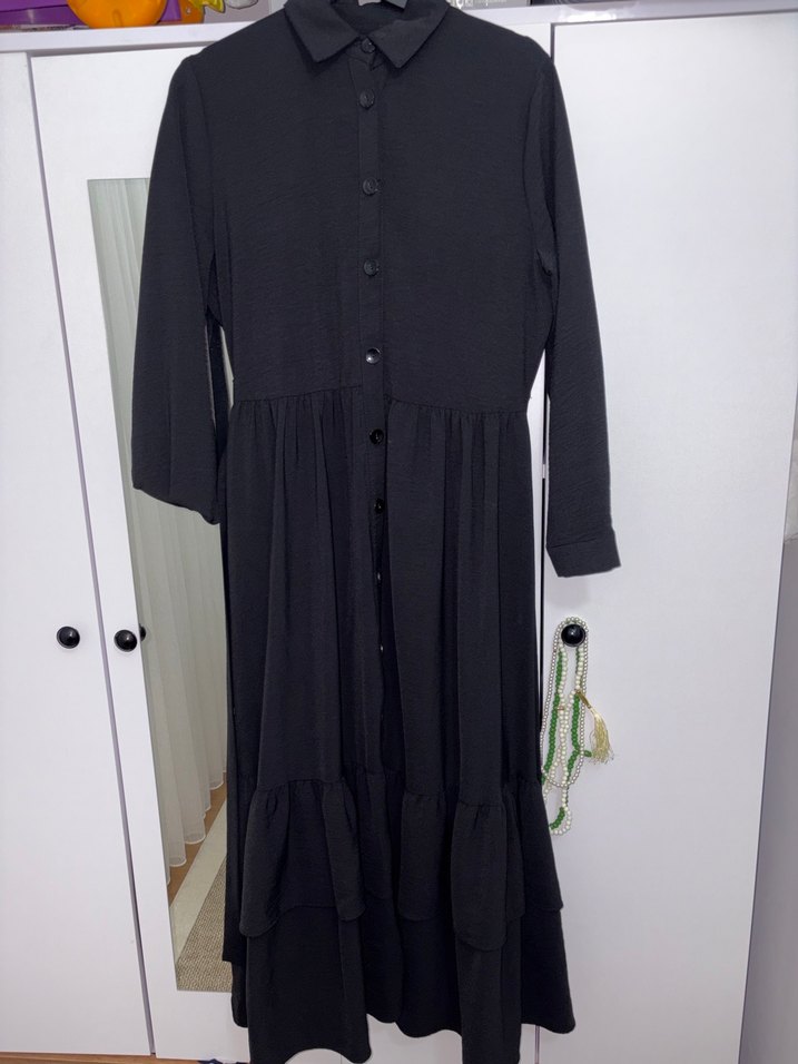 Düğmeli Siyah Uzun Elbise etek ucu fırfırlı