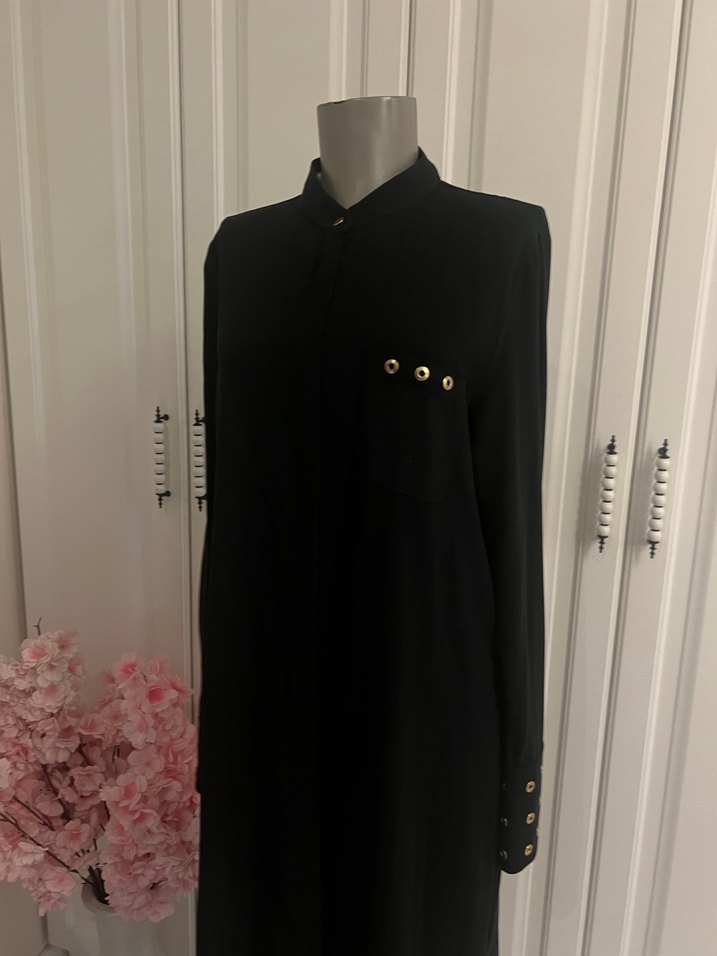 gold detaylı tunik 2 beden (40-42) kol altı 52 boy 114 önden düğmeli yandan yırtmaçlı ince yazlık çok kaliteli kumaşa sahip çok şık kol detayına sahip 250 tlDüğmeli ve yakalı, uzun kollu siyah uzun elbise. İpeksi kumaştan, düzenli kesim ve ofis için gotik tarzda.