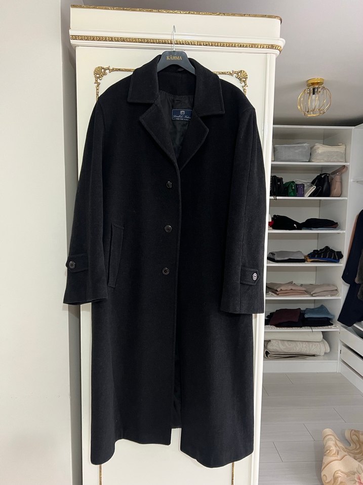 Düğmeli, siyah uzun erkek kaban, yumuşak ve sıcak kumaştan, klasik kesim, ofis için uygun, uzun kollu ve normal kesim.