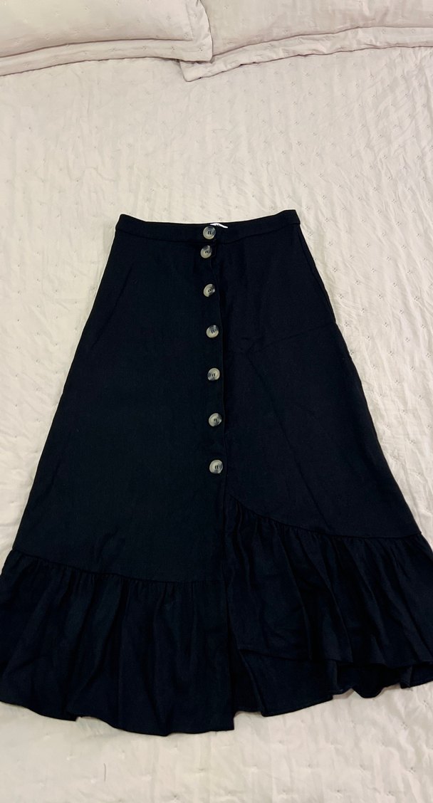 Düğmeli ön kısmı ve bol kesimiyle siyah uzun etek. Sentetik kumaştan yapılmıştır. Günlük kullanıma uygun sade ve trend goth tarzı.