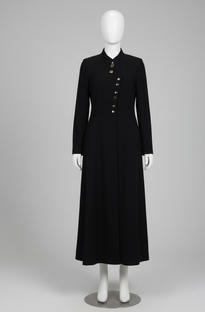 Siyah kadın ferace, düğmeli ve keskin yakalı, gotik tarzda klasik duruş sunar. mevsimlik, uzun kollu ve ofis kullanımı için uygundur.