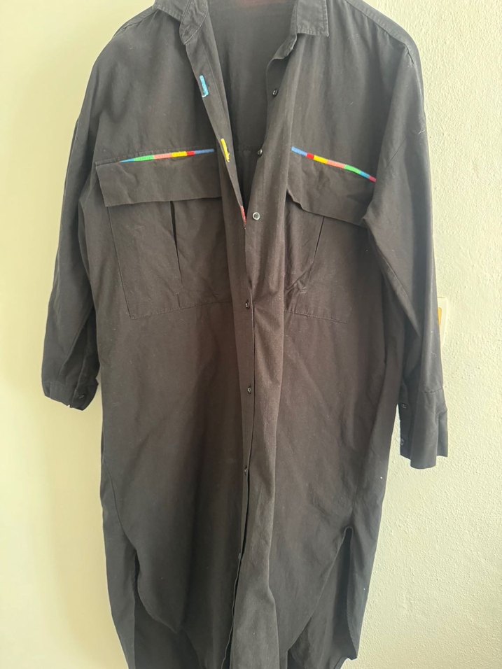 Düğmeli, uzun ve bol kesim hamile ceketi, yakalı ve uzun kolludur. Tekstil malzemeden yapılmış, ceplerinde çok renkli detaylar bulunur.