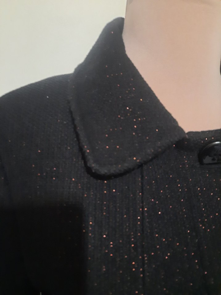 Düğmeli, siyah uzun hamile kabanı, yakasında kesik yaka bulunur. Sentetik kumaştan yapılmış, ofis ve gotik tarz için uygundur.