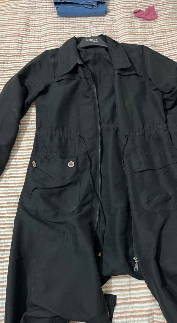 Siyah renkli, düğmeli ve uzun kesim hamile kabanı. Keten kumaştan, bol kesim, yaka detaylı ve uzun kolludur. Günlük sokak stiline uygundur.