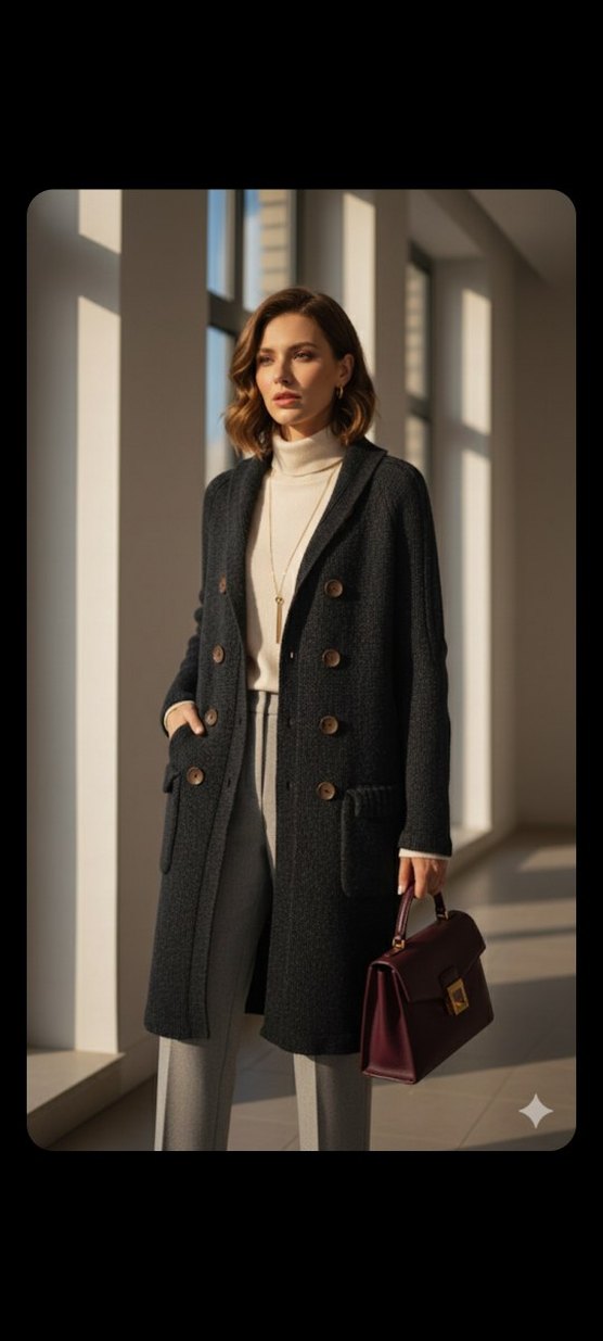 Bu siyah uzun hırka çift sıra düğmeli tasarıma ve ön ceplere sahiptir. Şık kesimi ve yumuşak dokusuyla serin havalar için uygundur.