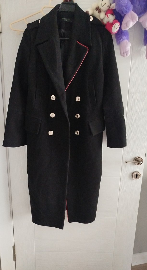 Siyah uzun kaban, çift sıra beyaz düğmeler ve yakada ince kırmızı detay ile. Ön cepler ve uzun kolludur.