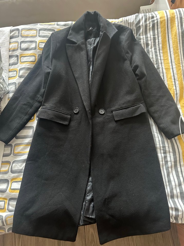 Düğmeli çift düğme kapamalı ve kapaklı ceplere sahip siyah uzun kaban, yumuşak ve sıcak kumaştan üretilmiştir. Ürün çok az kullanıldı. Omuz kısmı dardır. Giyildiği zaman direkt olarak üste oturuyor. Astarlıdır.