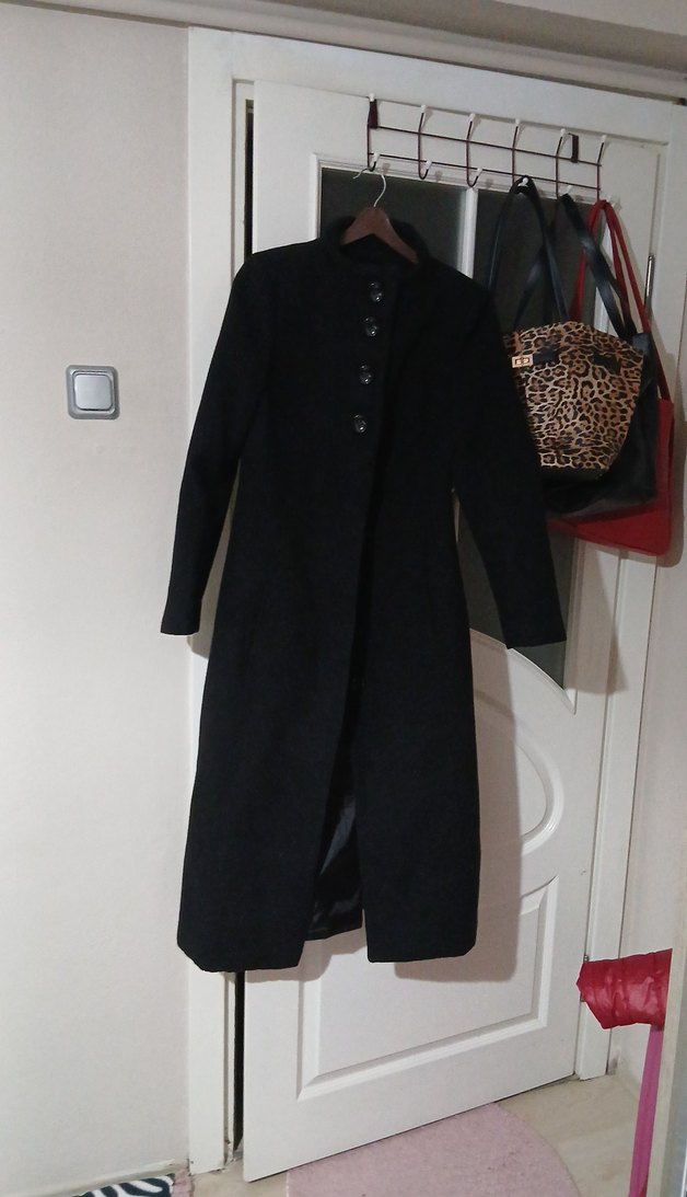 Düğmeli, uzun siyah kaban, sade ve şık tasarıma sahip. Uzun kollu ve düz kesimdir. çok sıcak tutar canlı siyah kusursuz beden uymadığı için satışta arka yırtmaçlı düğmeler alta kadar devam ediyo içten düğmeli