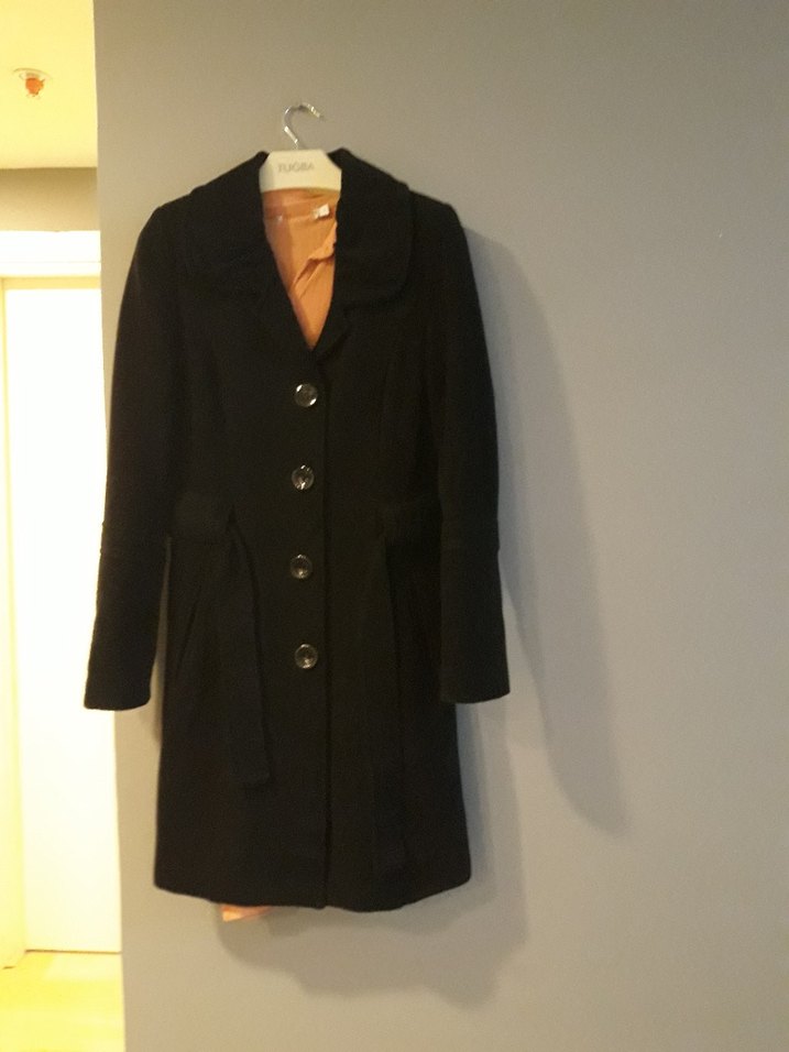Düğmeli ve klasik yakalı siyah kısa kaşe kaban. Belde kemer detayı ile şekillendirilmiş, soğuk havalar için uygun.
