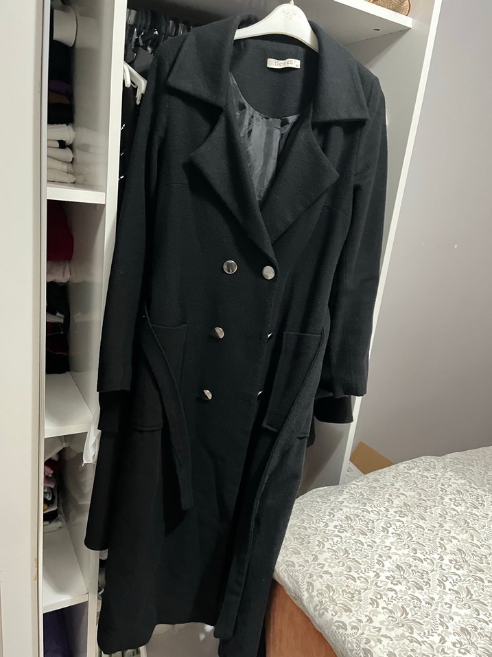 Çift düğmeli, geniş yakalı, büyük cepli uzun siyah kaban. İç kısmı yumuşak astarlıdır.