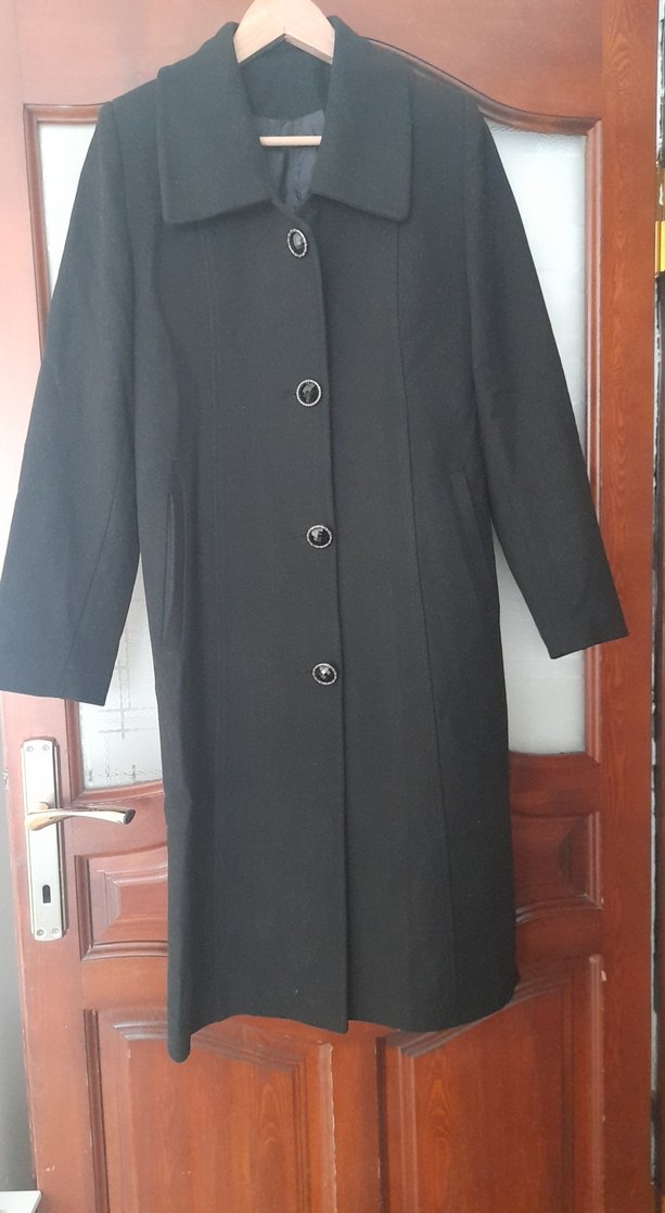 Klasik yakalı, düğmeli siyah uzun kaban. Uzun kollu ve düz kesim, sade ve şık bir görünüm sunar. 42 beden yazıyor ama 40 ta olur