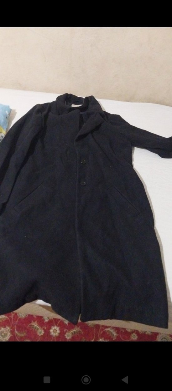 Düğmeli, siyah uzun hamile kabanı, yakasında kesik yaka bulunur. Bol kesim ve uzun kolludur, yumuşak ve sıcak kumaştan yapılmıştır, günlük kullanıma uygundur.