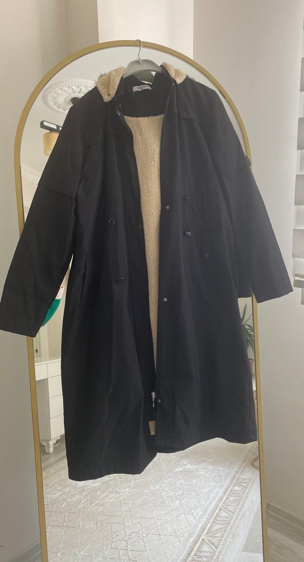 Düğmeli, siyah uzun kadın ceketi, bol kesim ve notalı yaka ile. Uzun kollu ve yumuşak, sıcak astarlı, gündelik kullanıma uygun.