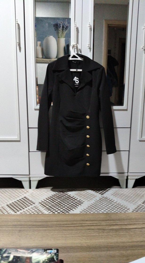 Düğmeli, uzun siyah kadın elbise yaka kısmında kesik detaylıdır ve uzun kolludur. İş ortamı için uygun, dar kesim ve sentetik kumaş kullanılmıştır. Yeni etiketli.