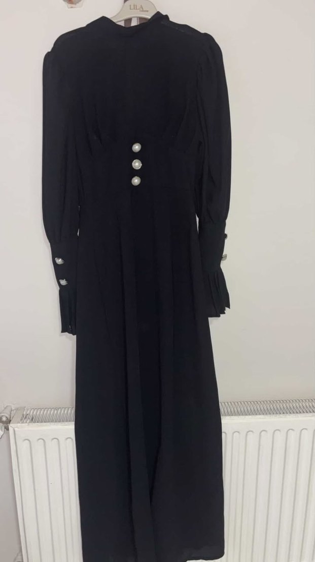 Düğmeli, uzun kollu siyah elbise, yakası kesik ve saten dokulu, klasik uyumda, ofis için uygun. Bikere giyildi bu hiçbir sıkıntısı yoktur özel dikim