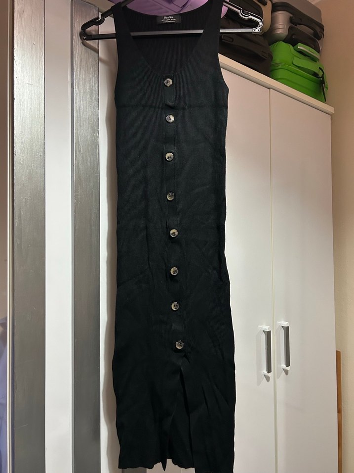 Düğmeli, siyah uzun elbise, kolsuz ve vücuda oturan kesime sahiptir. Notch yakalı ve düz dokuma sentetik kumaştan yapılmıştır. Çok temiz hiç kullanılmamış triko elbise