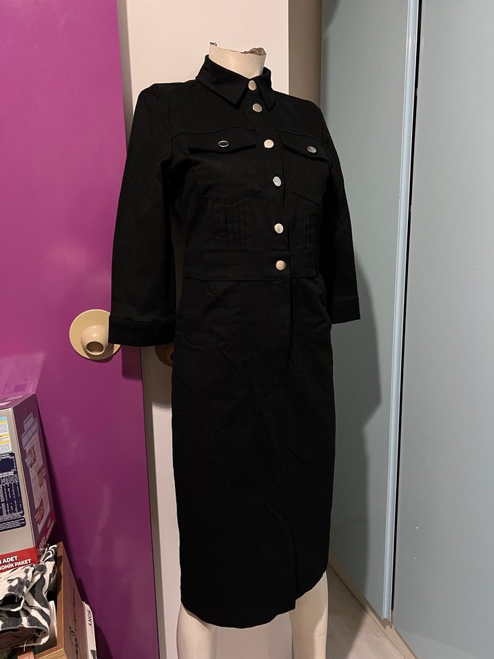 Düğmeli ön, uzun kollu ve gömlek yaka detaylı siyah uzun kadın elbise. Ofis için uygun, düz ve regular fit tasarım.