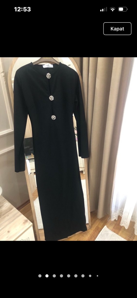 Siyah uzun elbise, düğmeli ve kesik yaka detaylıdır. Uzun kollu, regular fit ve iş ortamına uygun şık bir tasarımdır. Sentetik kumaştan üretilmiştir.