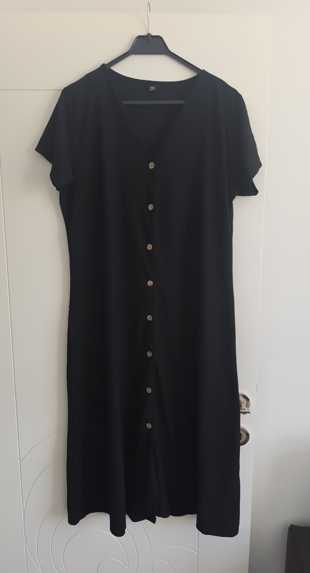 Siyah uzun boy, V yaka ve kısa kollu bu elbise, rahat günlük kullanım için bol kesim ve düğmeli tasarıma sahiptir. Minimalist tarzda.