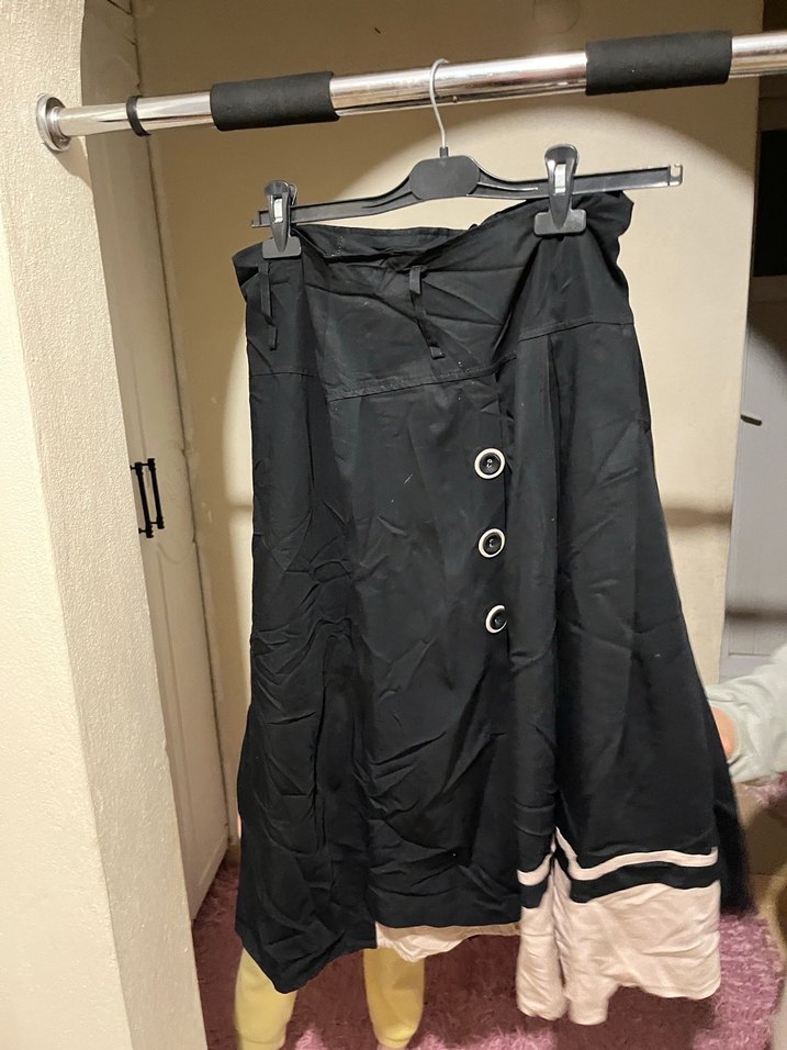 Düğmeli, salaş kesim siyah uzun etek, sentetik kumaştan. Alt kısmında hafif iki renkli detay bulunur. Goth tarzını yansıtır.