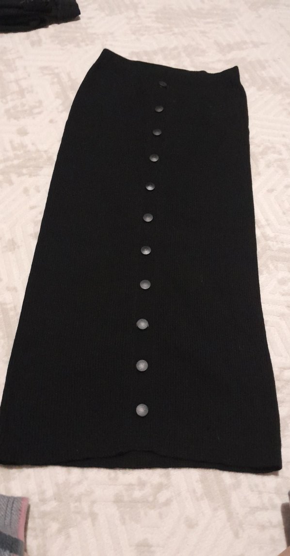 Düğmeli, siyah, uzun ve vücuda oturan bu etek, düz sentetik kumaştan yapılmıştır. Minimalist gotik tarzda günlük kullanıma uygundur.