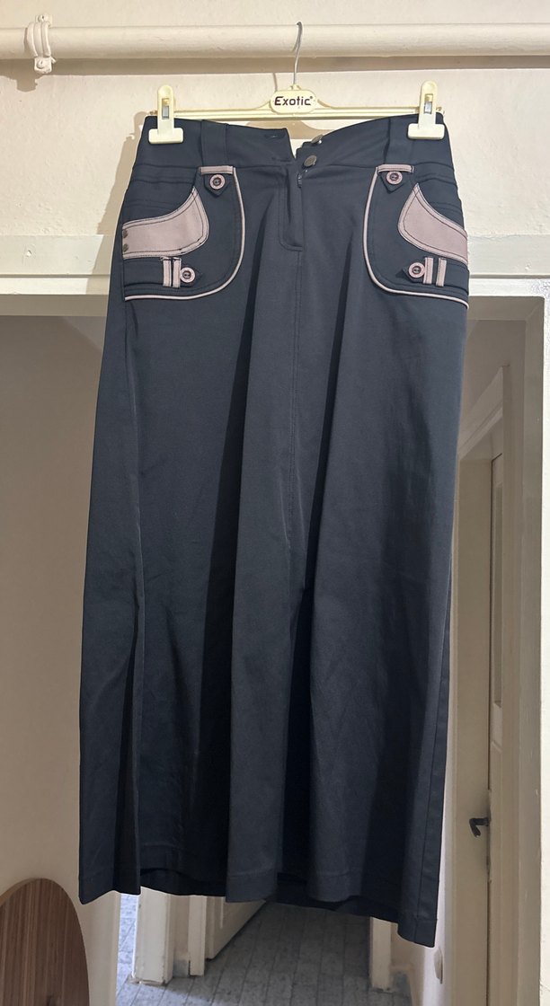 Siyah uzun etek, düğmeli cepler ve bol kesimiyle, sentetik kumaştan üretilmiş, ofis ve sokak stiline uygun Parisli avant-garde tasarım.