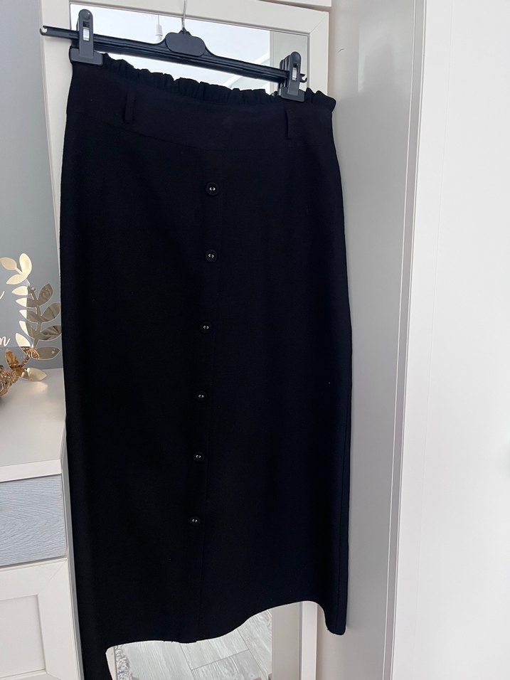 Düğmeli önü ve düz kesimiyle siyah uzun kadın eteği. Sentetik kumaştan olup iş ortamı ve gotik tarz için uygundur.