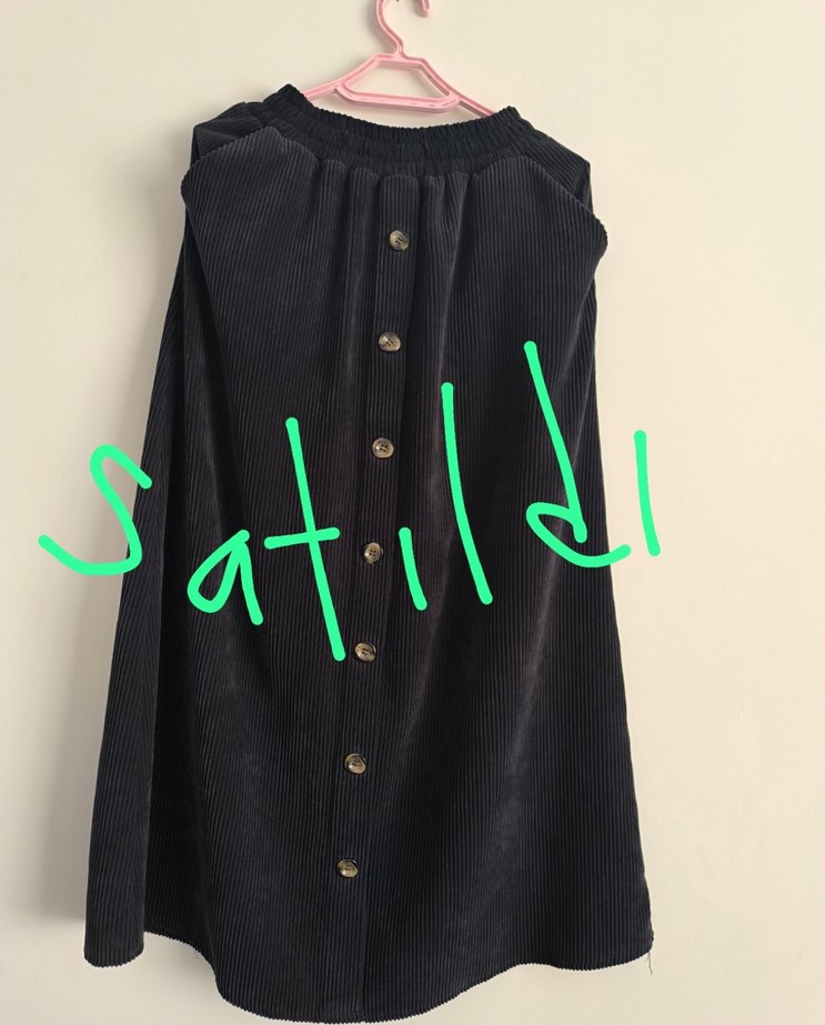 Düğmeli ve siyah renkte, vücuda oturan midi uzunluğunda kadın eteği. Pürüzsüz sentetik kumaştan üretilmiştir, iş ortamına uygundur. fitilli kışlık kumaş
