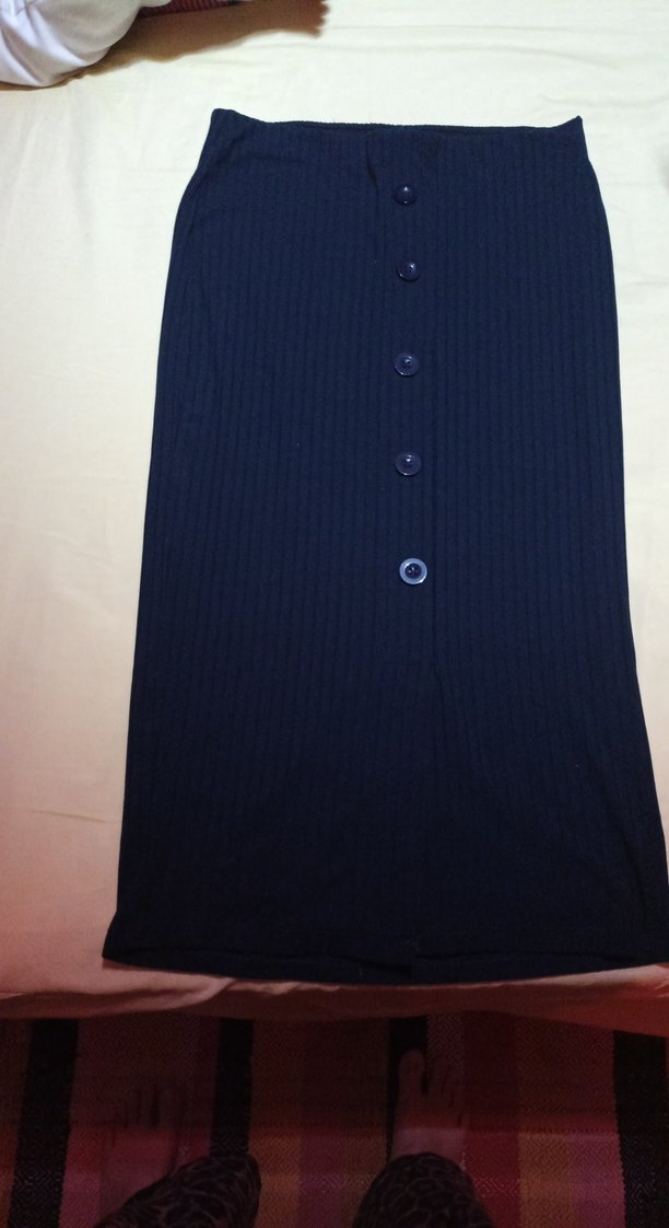 Düğmeli ön kısmı ve siyah sentetik kumaşıyla, günlük kullanıma uygun, minimal ve normcore tarzda fitted uzun kadın eteği. diz altindadir boyu