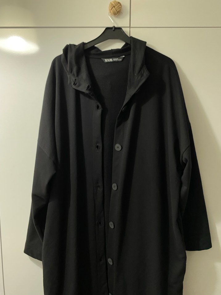 Düğmeli siyah uzun kadın hırka bol kesim ve uzun kollu. Notlu yaka ve yumuşak, sıcak dokuda, günlük kullanım için uygun. Ölçüler görsellerde mevcut (marka temsili)sadece 2 defa giyildi yeniden farksız beden olmadığı için satıyorum