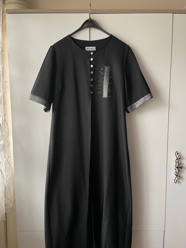 Düğmeli, kısa kollu ve bisiklet yakalı siyah uzun hırka. 44 beden, boy 125cm, Göğüs 52cm, Kalça 59cm, Kol omuzdan 42cm. Üstten 7 düğmesi var sonrasında düğme yok.Çok az kullanıldı.