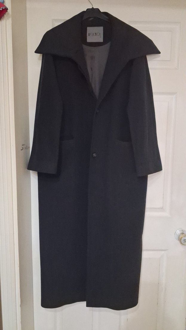Düğmeli, siyah uzun kaban, klasik gotik tarzda. Yumuşak ve sıcak kumaştan, regular fit, uzun kollu ve yaka detaylıdır. arkası yırtmaçlı. hasarsız sıfır ayarında