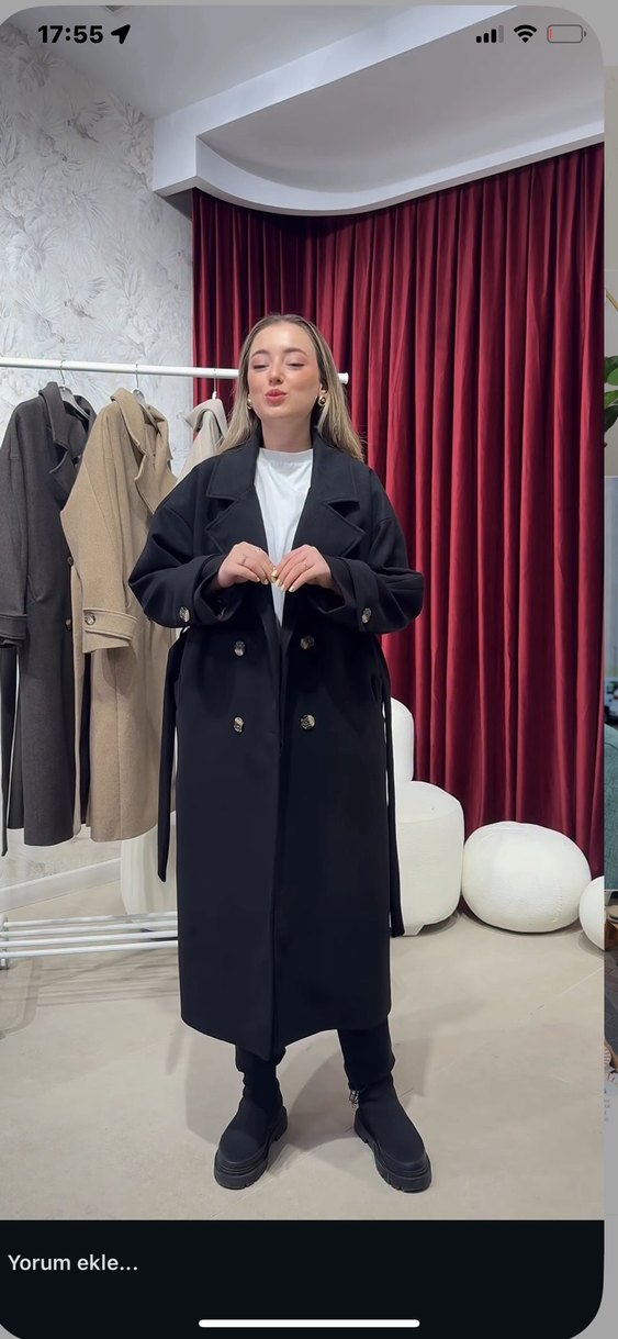 Düğmeli ve kesik yakalı siyah uzun kadın kaban. Uzun kollu, rahat kesim ve yumuşak, sıcak tutan kumaştan yapılmıştır. 1.35cm Bir defa giydim