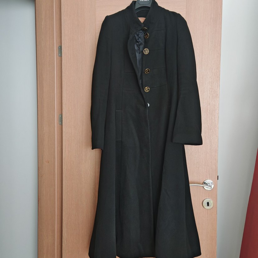 Düğmeli siyah uzun kadın kaban, notalı yaka ve uzun kolludur. Yumuşak, sıcak kumaştan üretilmiş, klasik şıklık ve ofis kullanımı için uygundur.