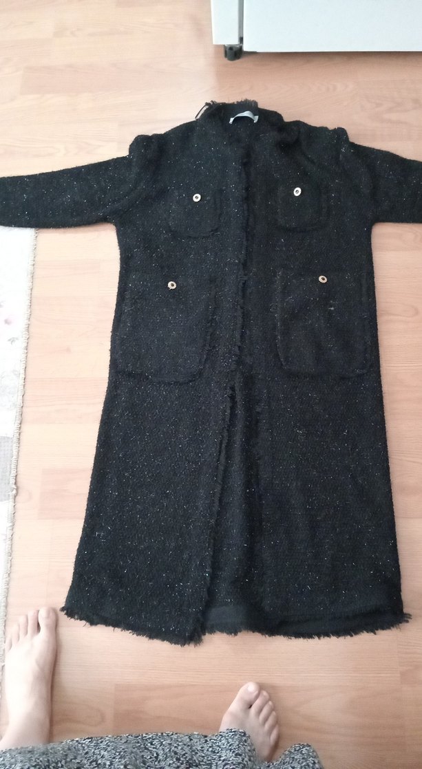 Düğmeli, siyah uzun kadın kaban, bol kesim ve yaka detayına sahiptir. Yumuşak sentetik kumaştan yapılmış, desen içermeyen rahat ve günlük sokak tarzı bir üründür.