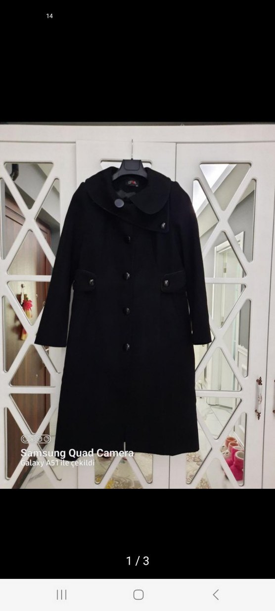 Düğmeli önü, kesik yakası ve uzun kollu siyah uzun kaban. Günlük kullanıma uygun, klasik şıklık sunan rahat kesim.