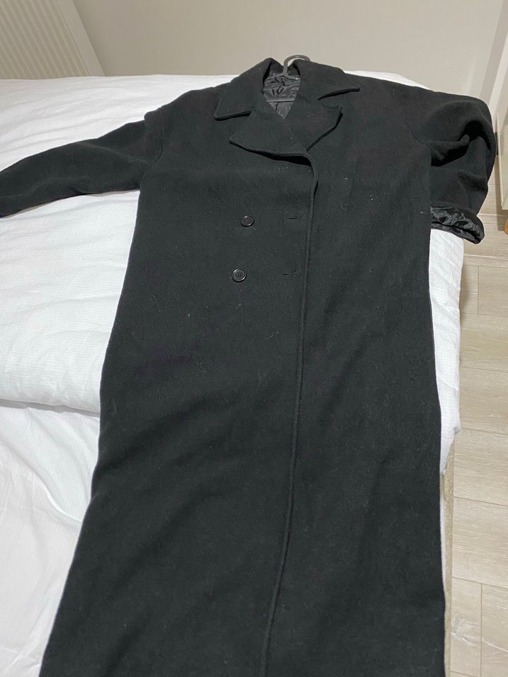 Düğmeli, siyah uzun kaban, geniş yakalı ve uzun kollu, yumuşak ve sıcak kumaştan, günlük kullanım için uygundur.