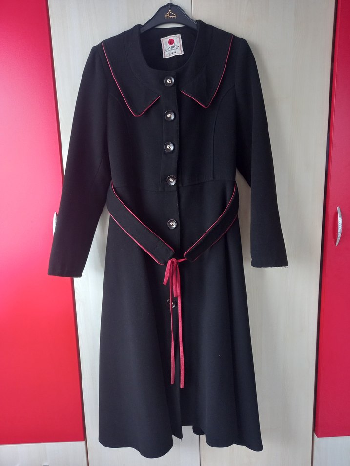 Düğmeli siyah uzun kadın kaban, işlemeli yakası ve bel bağcığı ile dikkat çeker. Strappy kollu, regular fit ve yumuşak, sıcak kumaştan üretilmiştir.