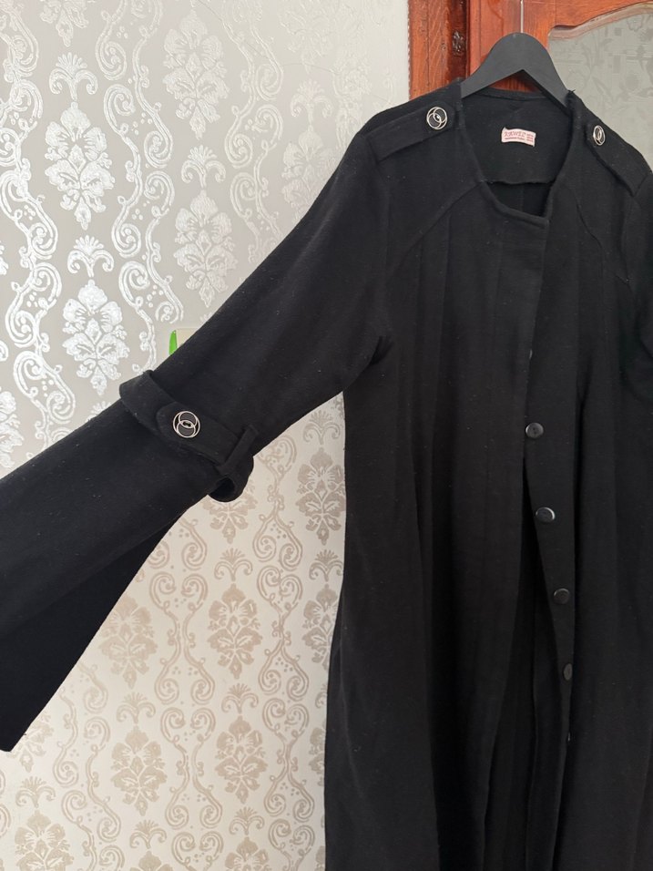 Siyah keten kumaştan yapılmış, düğmeli, uzun kollu, notched yaka detaylı, bol kesim gothic tarzında kadın kaban. Günlük kullanıma uygun.