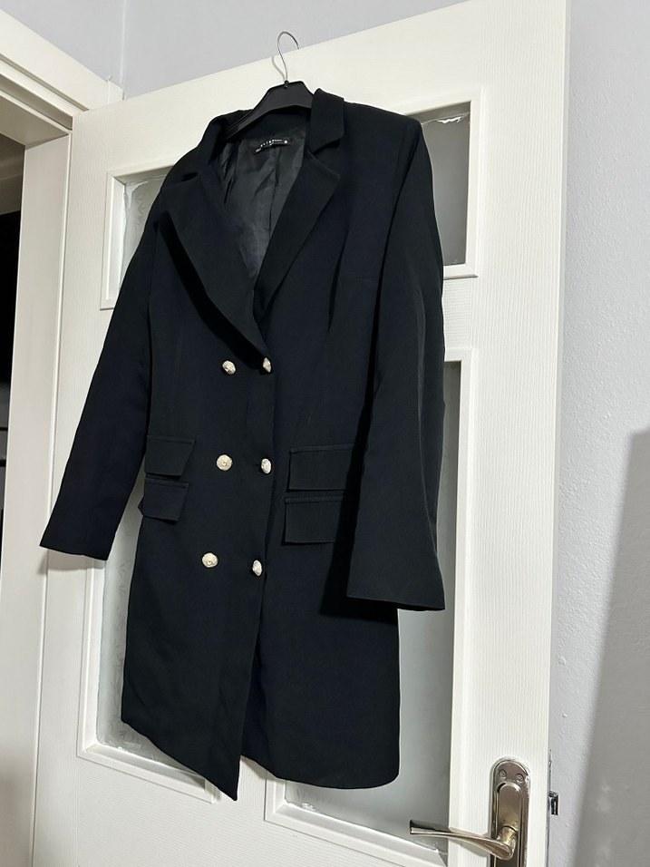 Düğmeli siyah uzun kadın ceketi, keskin yakalı ve düğmeli ön tasarıma sahiptir. Rahat kalıplı ve uzun kolludur, yumuşak sentetik kumaştan üretilmiştir. Ofis için modern klasik stile uygundur.