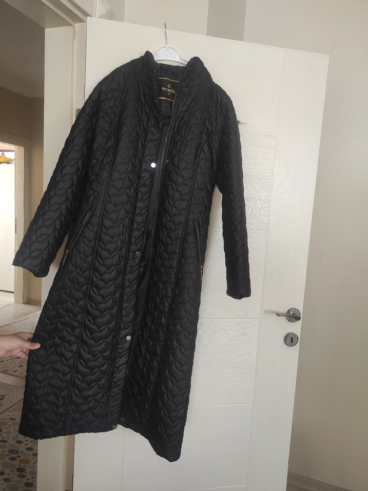 Düğmeli kapamalı, siyah uzun kadın mont, sentetik kumaştan, notched lapel yakalı, rahat kesim ve uzun kolludur. Günlük kullanıma uygundur. hiç kullanılmadı kemeri yok sadece 38-40 arası olur