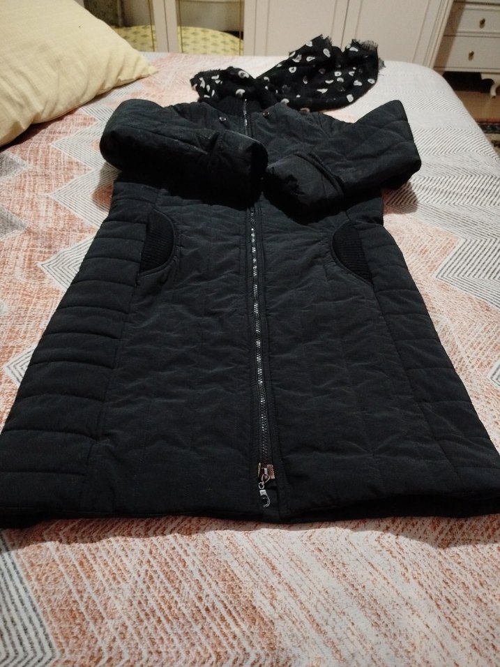 Düğmeli, balıkçı yakalı, uzun kollu, siyah, vücuda oturan kadın mont. Yumuşak sentetik kumaştan üretilmiştir. ufak söküğü var foto da gösterdim