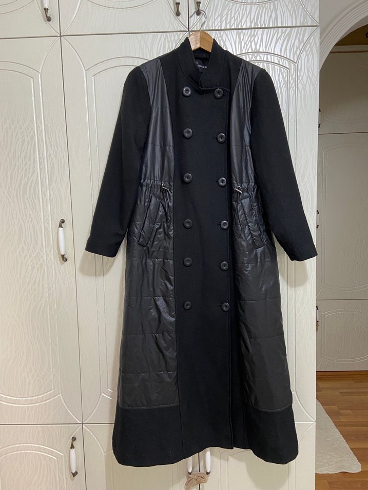Düğmeli, koyu siyah uzun kadın palto. Notch yakalı, uzun kollu, yumuşak ve sıcak kumaştan, günlük kullanıma uygun, rahat kesim.