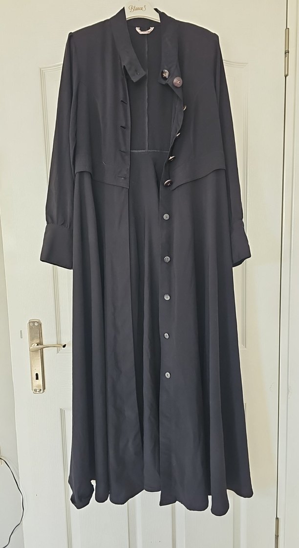 Bu uzun siyah kadın kabanı pardesü düğmeli ve bol kesimdir. Notlu yaka ve uzun kolludur, ipeksi kumaştan üretilmiştir. pek kırışma yapmayan yazlık veya mevsimlik kumaştır. hakim yaka düğmeli pardesü belden oturmalı ve bol kesim etek kısmı mevcut.