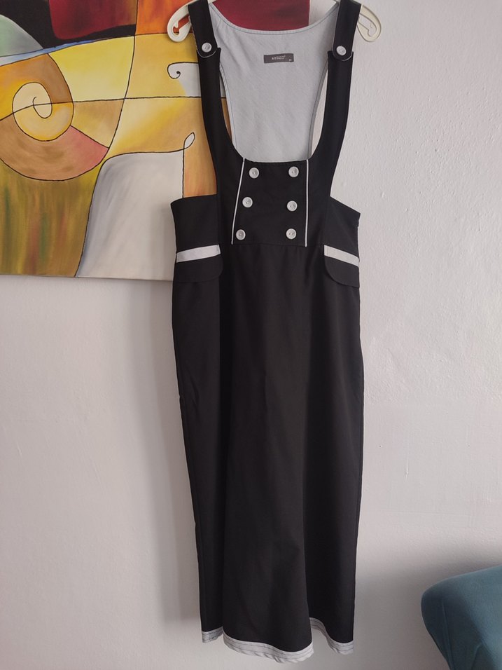 Düğmeli ön kısmı ve askısız yakasıyla siyah uzun kadın salopet, sentetik kumaştan yapılmıştır ve günlük kullanım için uygundur. Düzenli kesim ve kolsuz tasarıma sahiptir.