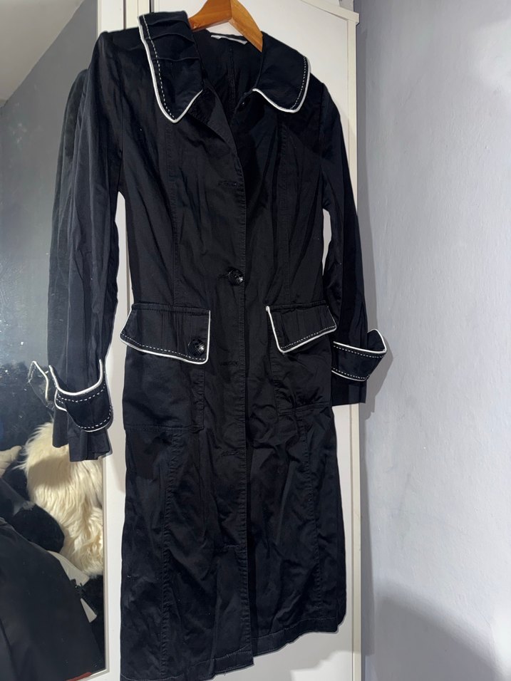 Bu siyah uzun trençkot, düğmeli ön kısmı ve kesimli yaka detayıyla fitted kesime sahiptir. Uzun kollu ve ceplerde, manşetlerde ince beyaz şerit detayları bulunur.