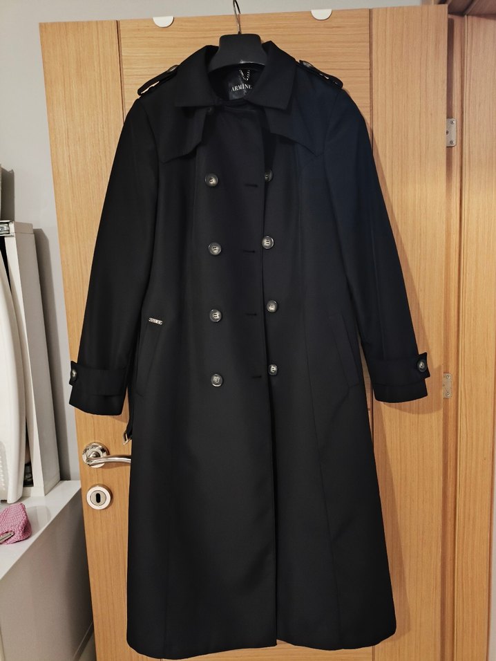 Düğmeli ön kısmı ve sivri yaka detayı olan siyah uzun trençkot. Sentetik kumaştan, klasik şıklık ve ofis kullanımı için uygun, regular fit ve uzun kollu.